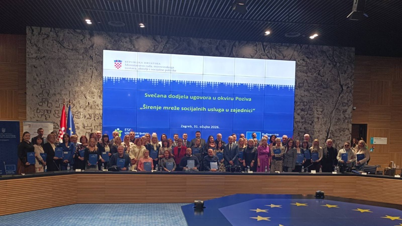 UOSIKAŽU je sudjelovala na svečanom potpisivanju i uručivanju ugovora za Poziv „Širenje mreže socijalnih usluga u zajednici“, održanom 31. ožujka 2026. u Nacionalnoj i sveučilišnoj knjižnici u Zagrebu, u organizaciji Ministarstva rada, mirovinskoga sustava, obitelji i socijalne politike.