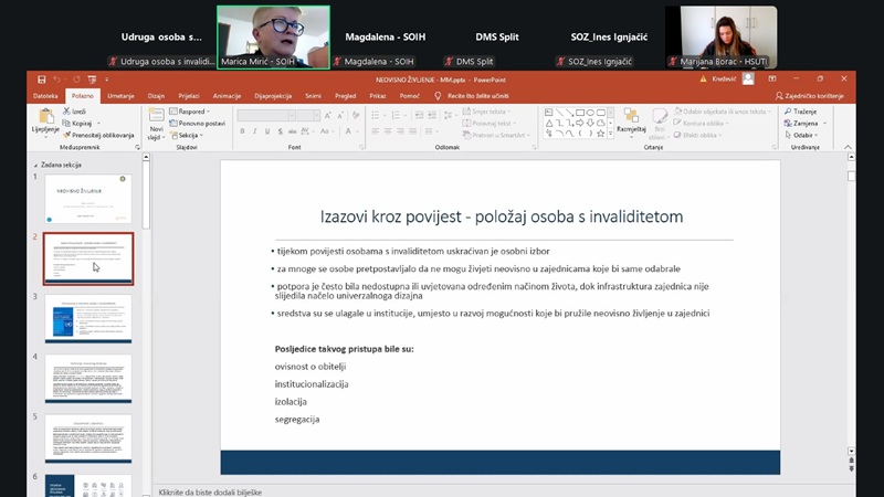 Edukaciju je vodila predsjednica SOIH-a, Marica Mirić, koja je kroz sveobuhvatno i stručno izlaganje predstavila aktualne smjernice i promjene u konceptu neovisnog življenja na europskoj razini. Poseban naglasak stavljen je na djelovanje Europske mreže neovisnog življenja (ENIL), koja je dodatno unaprijedila i proširila okvir neovisnog življenja povećanjem broja njegovih temeljnih sastavnica s dosadašnjih 12 na ukupno 18.