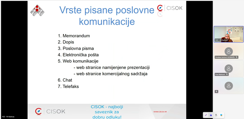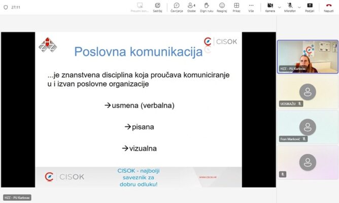 Dana 20. veljače 2026. godine održano je online predavanje na temu „Pisana komunikacija i poslovno dopisivanje“, koje je vodila Helena Šegavić, savjetnica iz Centra za informiranje i savjetovanje o karijeri (CISOK), Hrvatski zavod za zapošljavanje, Područni ured Karlovac.