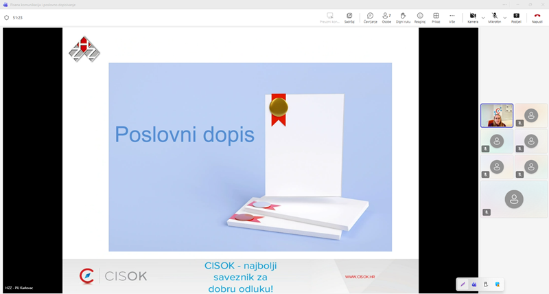 Dana 20. veljače 2026. godine održano je online predavanje na temu „Pisana komunikacija i poslovno dopisivanje“, koje je vodila Helena Šegavić, savjetnica iz Centra za informiranje i savjetovanje o karijeri (CISOK), Hrvatski zavod za zapošljavanje, Područni ured Karlovac.