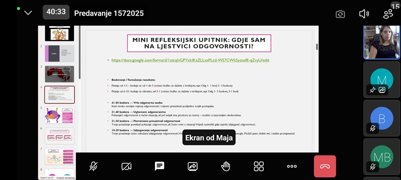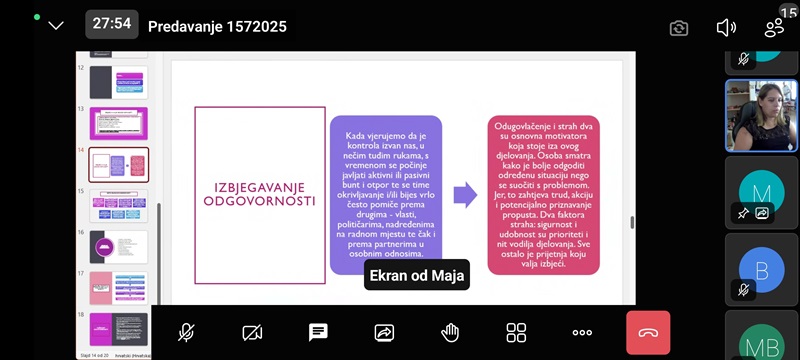 Kroz jasne i praktične primjere iz svakodnevnih situacija, predavačica je ukazala na načine kako postepeno razvijati odgovorno ponašanje – od prepoznavanja vlastitih obrazaca do usvajanja navika koje vode većem osjećaju samopouzdanja i kontrole nad vlastitim životom.