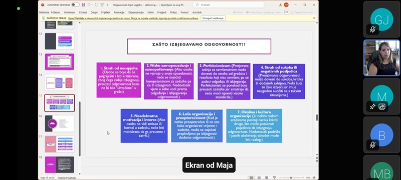 Tijekom predavanja sudionici su imali priliku upoznati se s različitim oblicima odgovornosti, razlikom između odgovornosti i krivnje, mehanizmima izbjegavanja odgovornosti i važnošću preuzimanja odgovornosti.