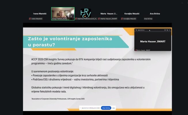 Hrvatski centar za razvoj volonterstva (HCRV) je 16. ožujka 2026. godine održao webinar pod nazivom „Volontiranje zaposlenika kao dio društveno odgovornog poslovanja“. Webinar je bio namijenjen predstavnicima i predstavnicama volonterskih centara te organizatorima volontiranja koji žele bolje razumjeti potencijal i specifičnosti uključivanja poslovnog sektora u volonterske aktivnosti, kao i mogućnosti uspostave i razvoja kvalitetne i dugoročne suradnje s tvrtkama.