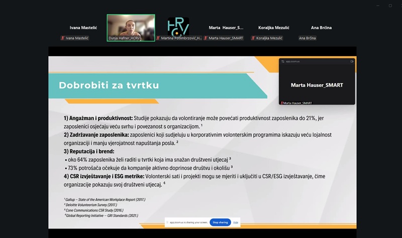 Dunja Hafner iz HCRV-a sudionicima je predstavila koncept korporativnog volontiranja, njegove najčešće oblike te motive zbog kojih se poslovni sektor sve češće uključuje u volonterske aktivnosti. Poseban naglasak stavljen je na dobrobiti koje takav oblik volontiranja donosi od jačanja povezanosti unutar zajednice, razvoja solidarnosti i društvene odgovornosti do stvaranja pozitivnog utjecaja na zaposlenike i organizacije koje primaju podršku.
